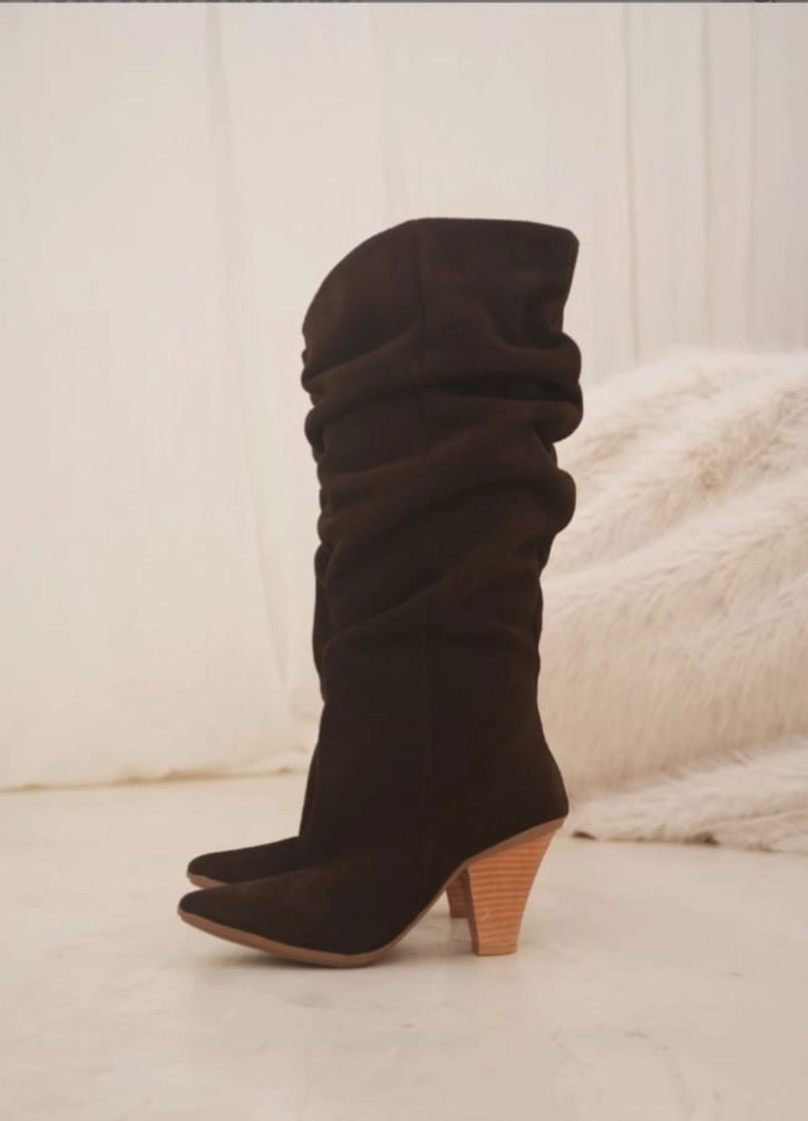 Su diseño con efecto arrugado en la caña aporta un look moderno y relajado, ideal para combinar tanto con jeans como con vestidos o looks más urbanos. El taco medio brinda la altura justa para estilizar la figura sin perder confort, permitiendo un uso prolongado durante toda la jornada.