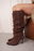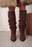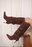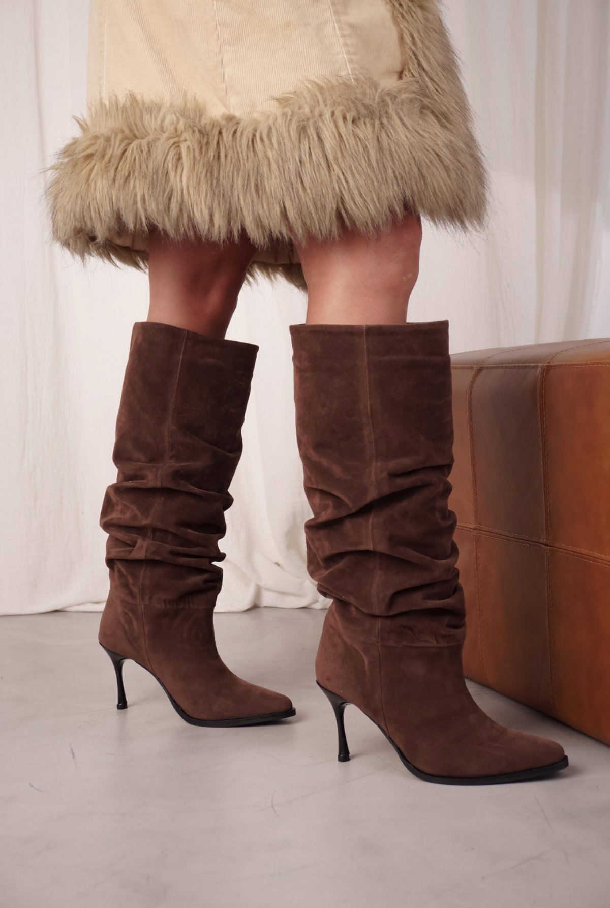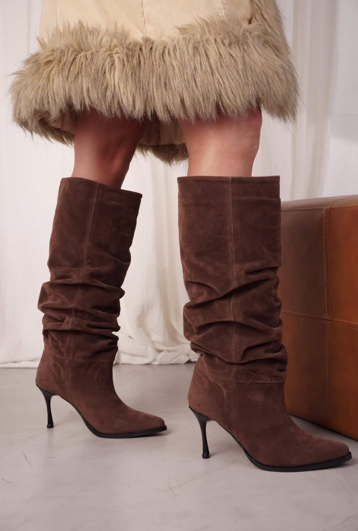 Botas caña alta en tono chocolate con base negra: el equilibrio perfecto entre elegancia y actitud. Confeccionadas en material suave tipo gamuza que se adapta a la pierna, con efecto fruncido que estiliza y suma tendencia. Punta fina y taco aguja que eleva cualquier look, ideal para pasar del día a la noche sin esfuerzo.