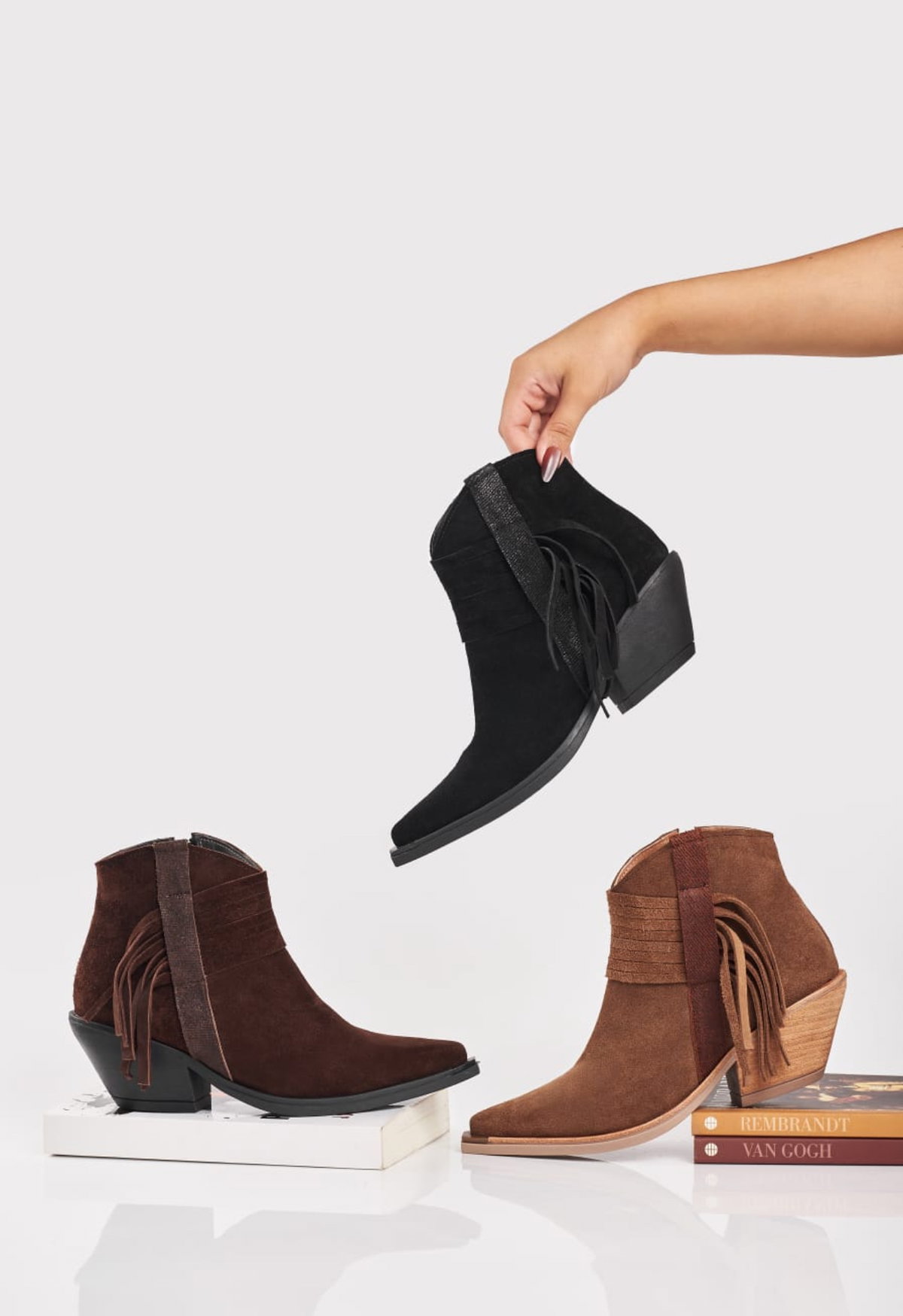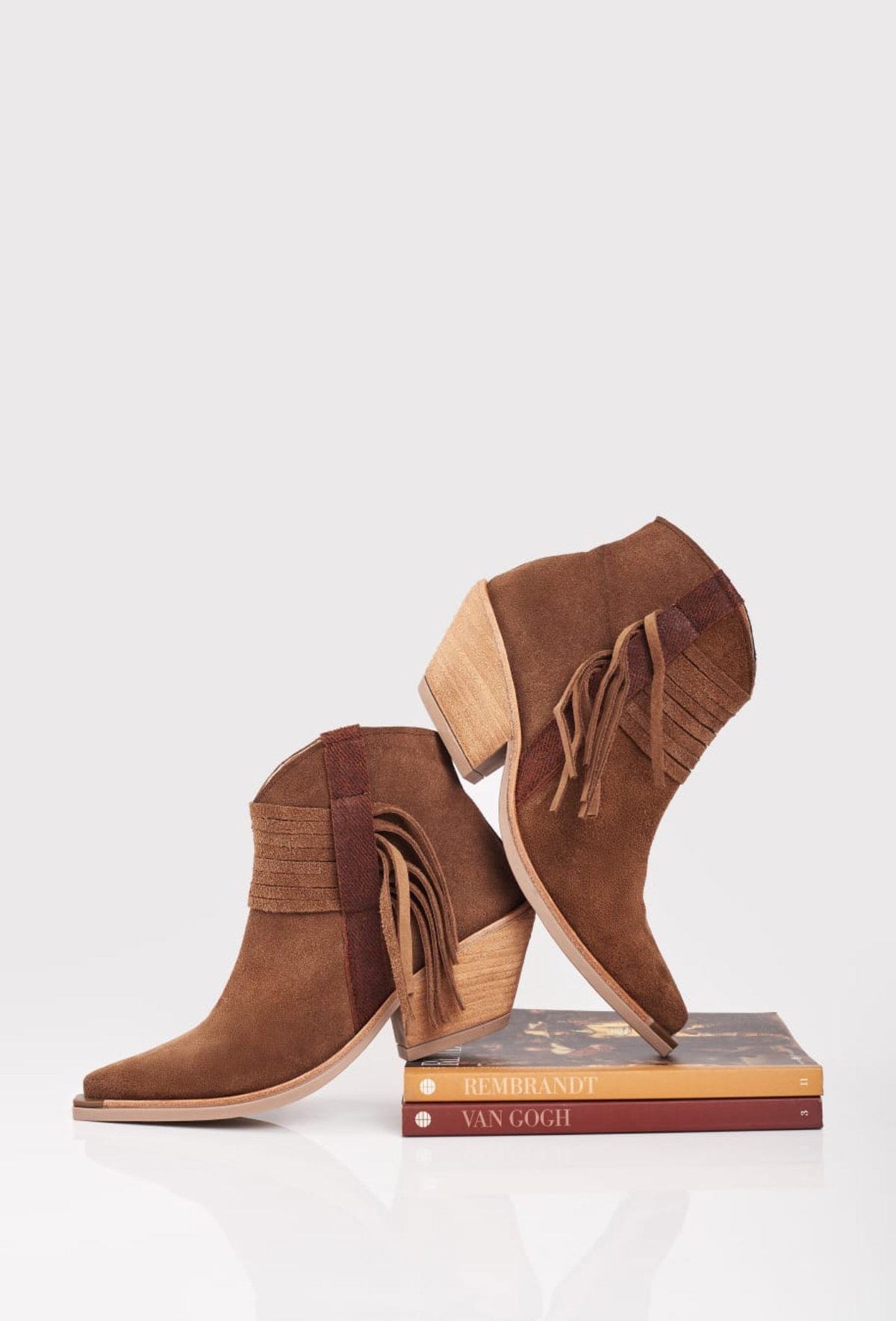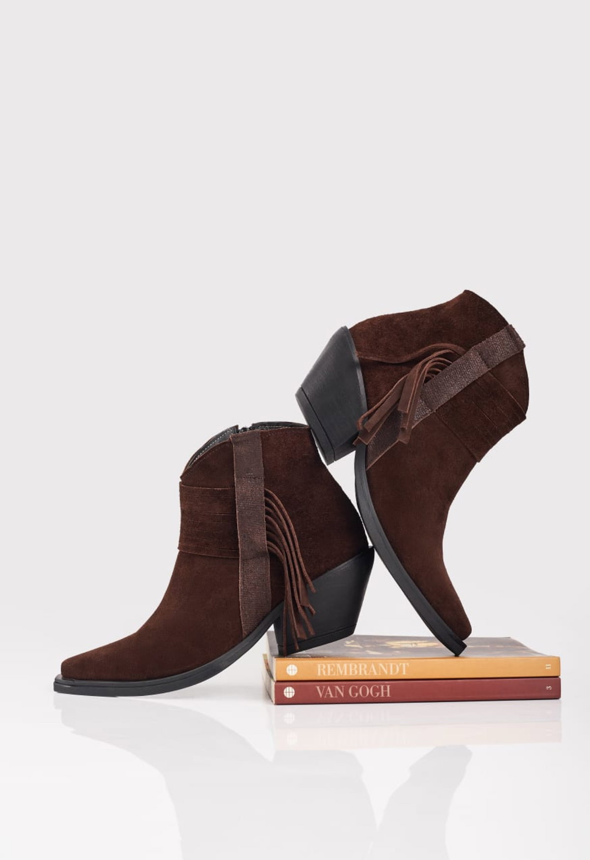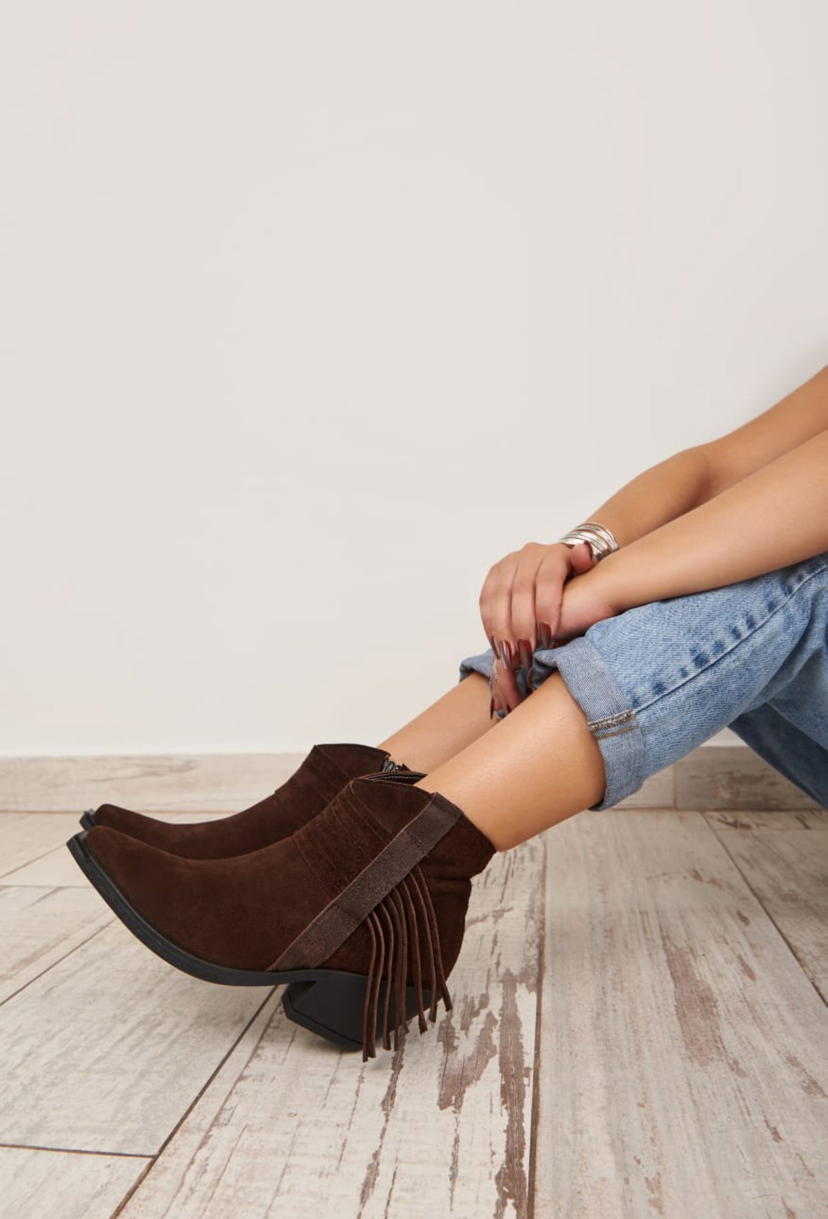 Texanas Piera Gamuzadas cuero usado con un detalle de flecos a su costado cierre lateral base de goma antideslizante vienen en color chocolate suela y negro del 36 al 40