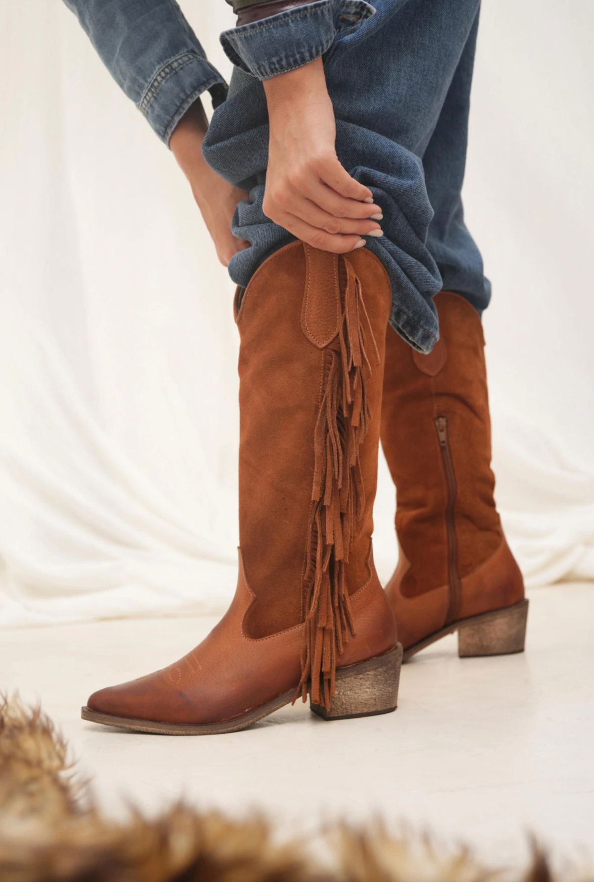 Bota texana de caña alta con mix de texturas que realza el diseño y le aporta un estilo más sofisticado y moderno.