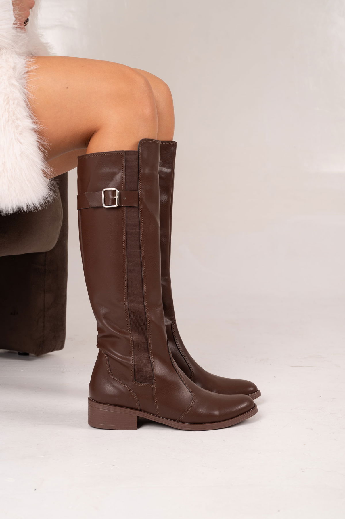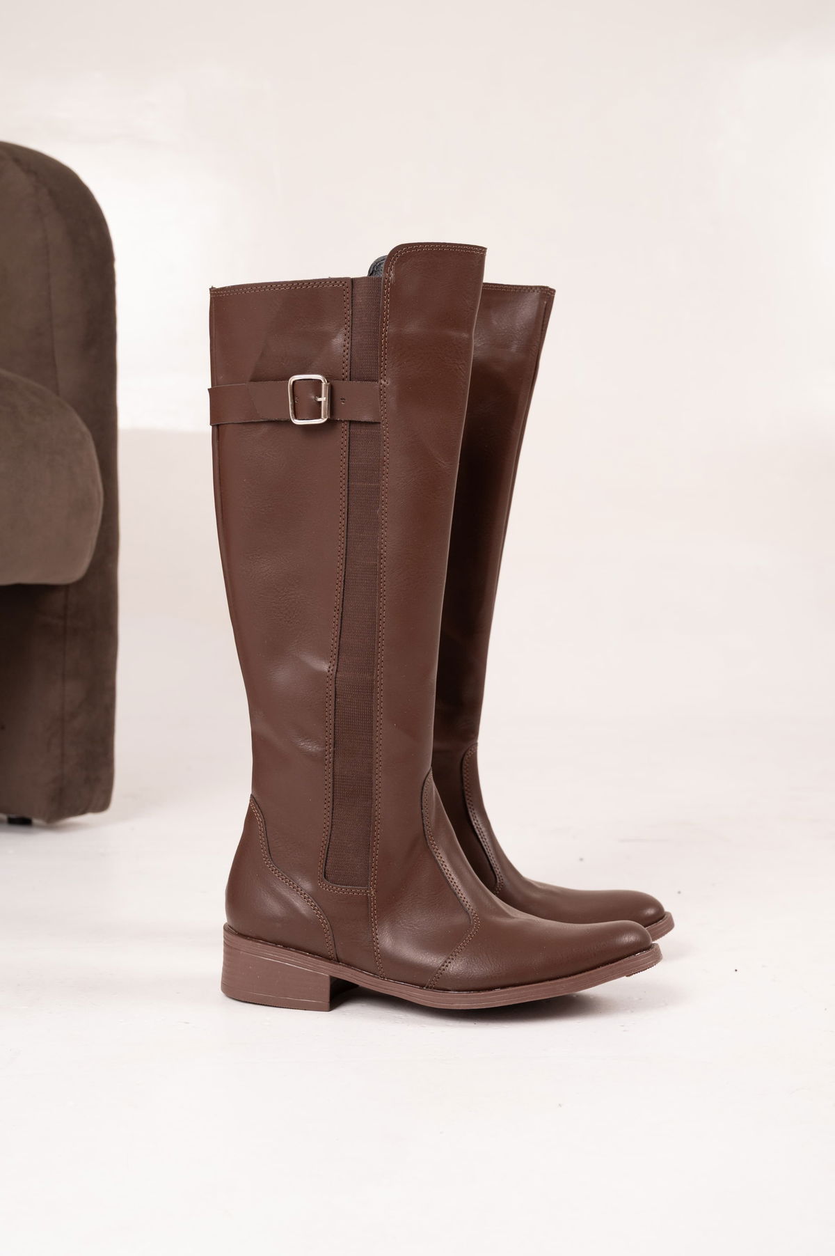 Botas de caña alta confeccionadas en material PU de alta calidad, un material resistente, flexible y fácil de limpiar. Su diseño clásico con detalle de hebilla lateral y cierre interno permite un calce práctico y cómodo.