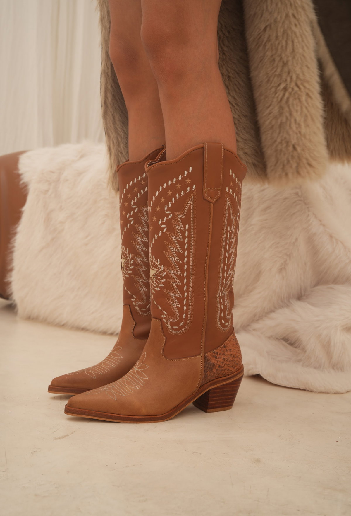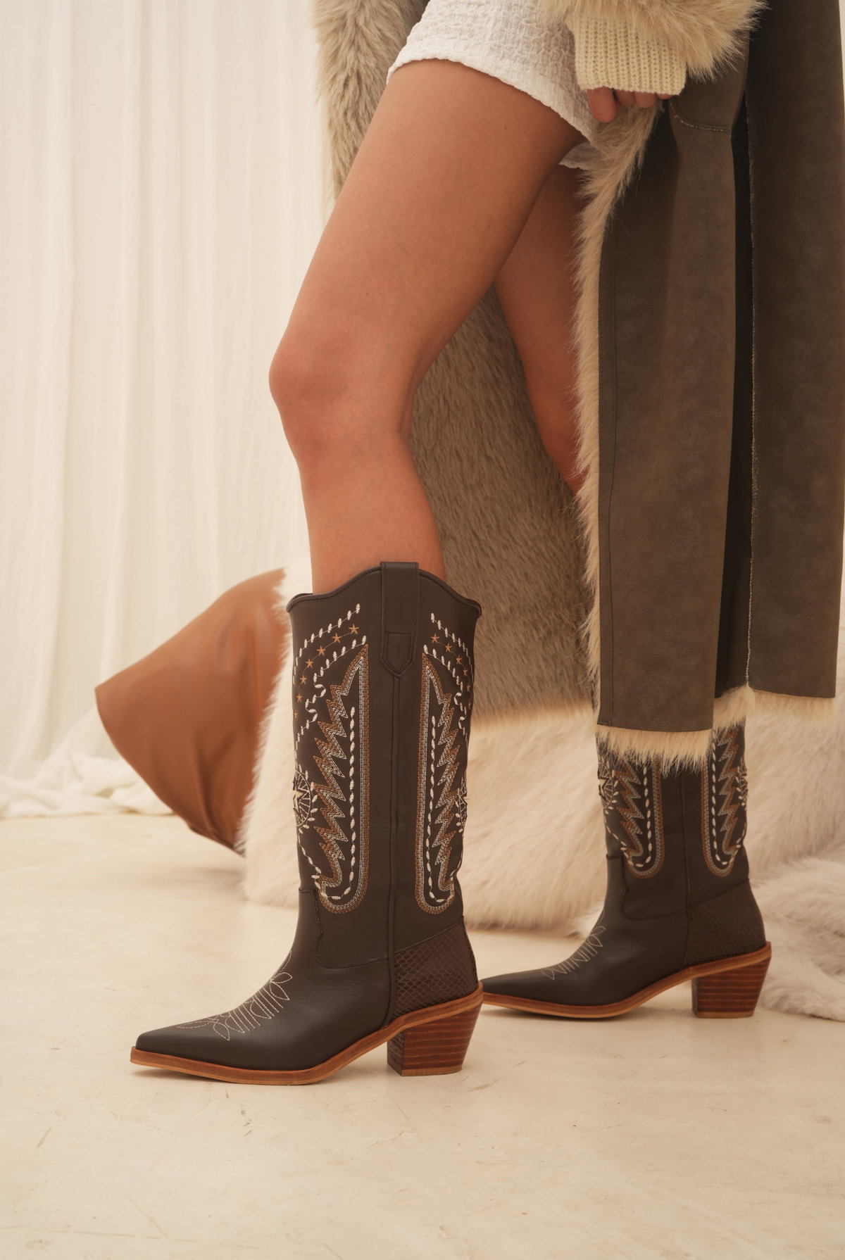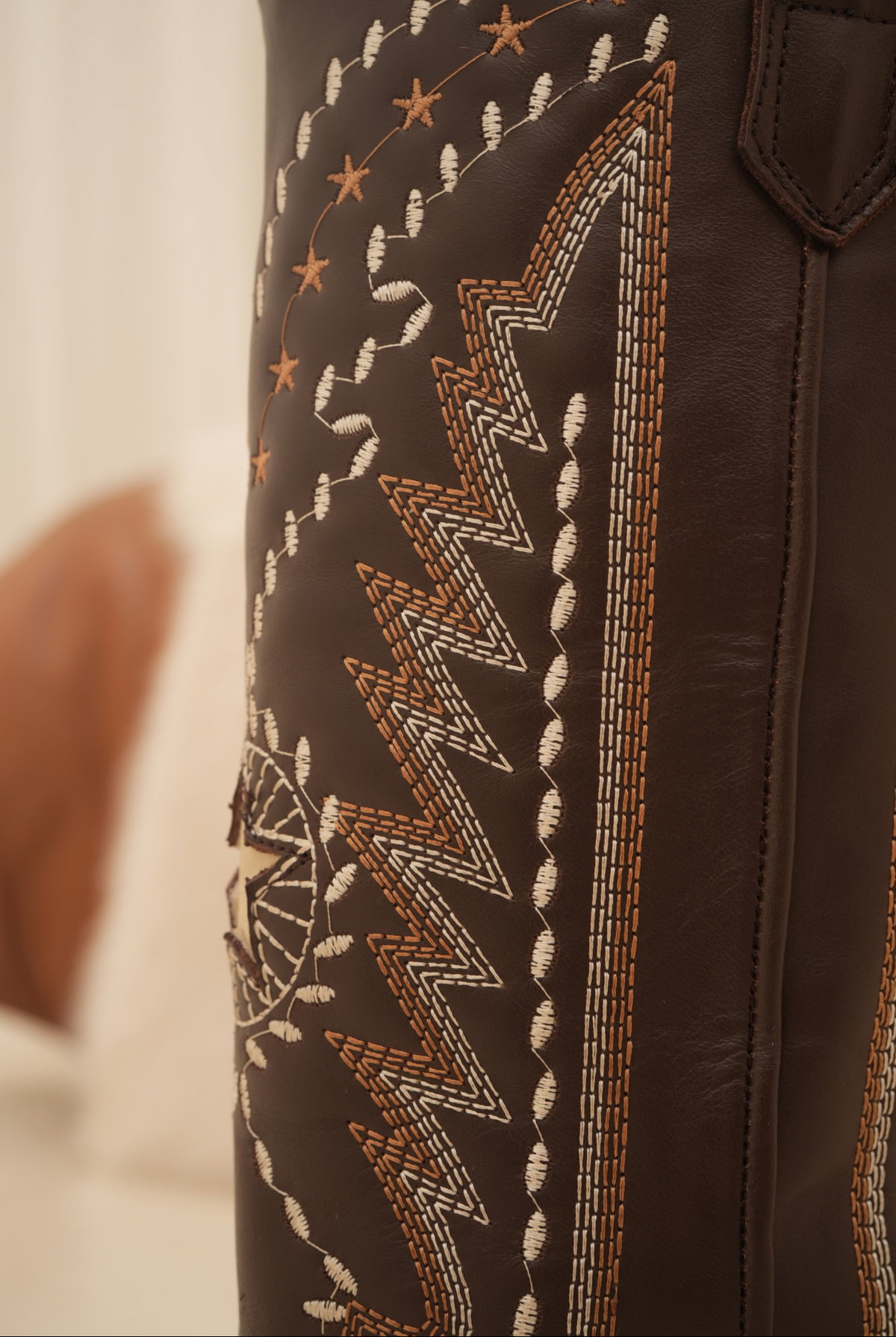 Texanas de cuero bordadas que combinan estilo, carácter y comodidad en cada paso. Confeccionadas en cuero de alta calidad, se destacan por sus delicados bordados artesanales que elevan cualquier look y les dan un toque único y auténtico.