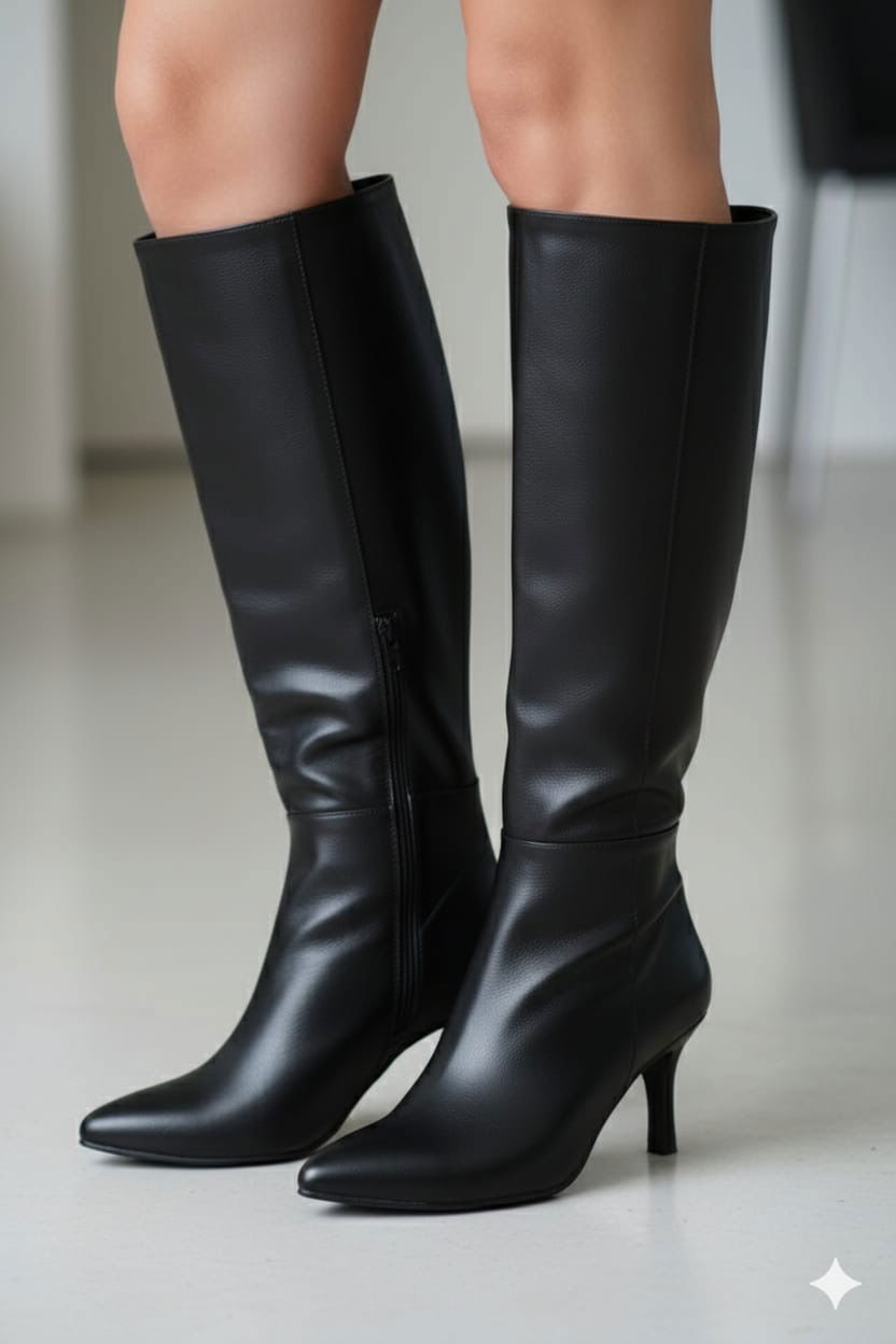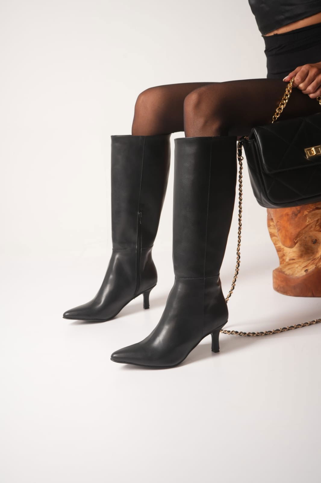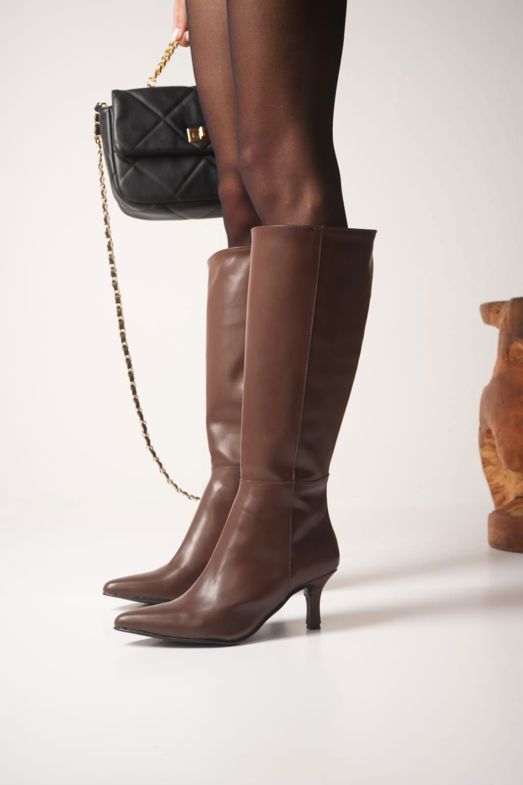 Botas largas con cierre lateral taco chupete de 5 cm punta fina en color chocolate y negro del 35 al 40
