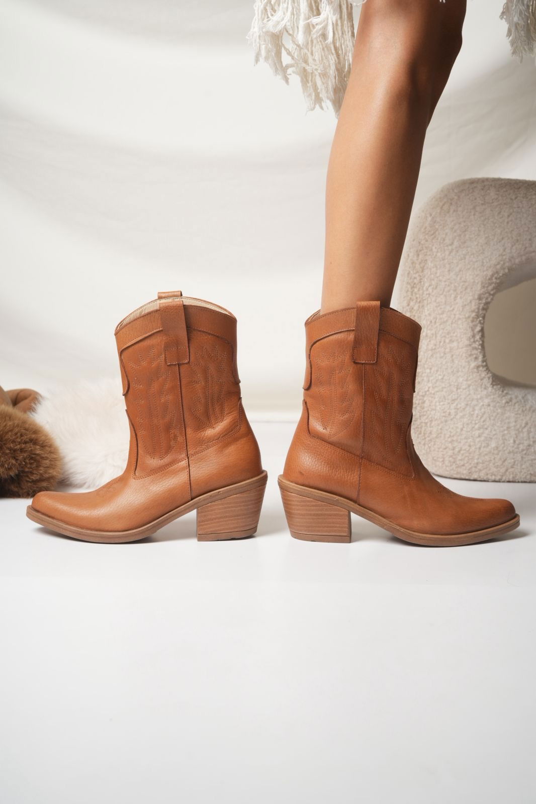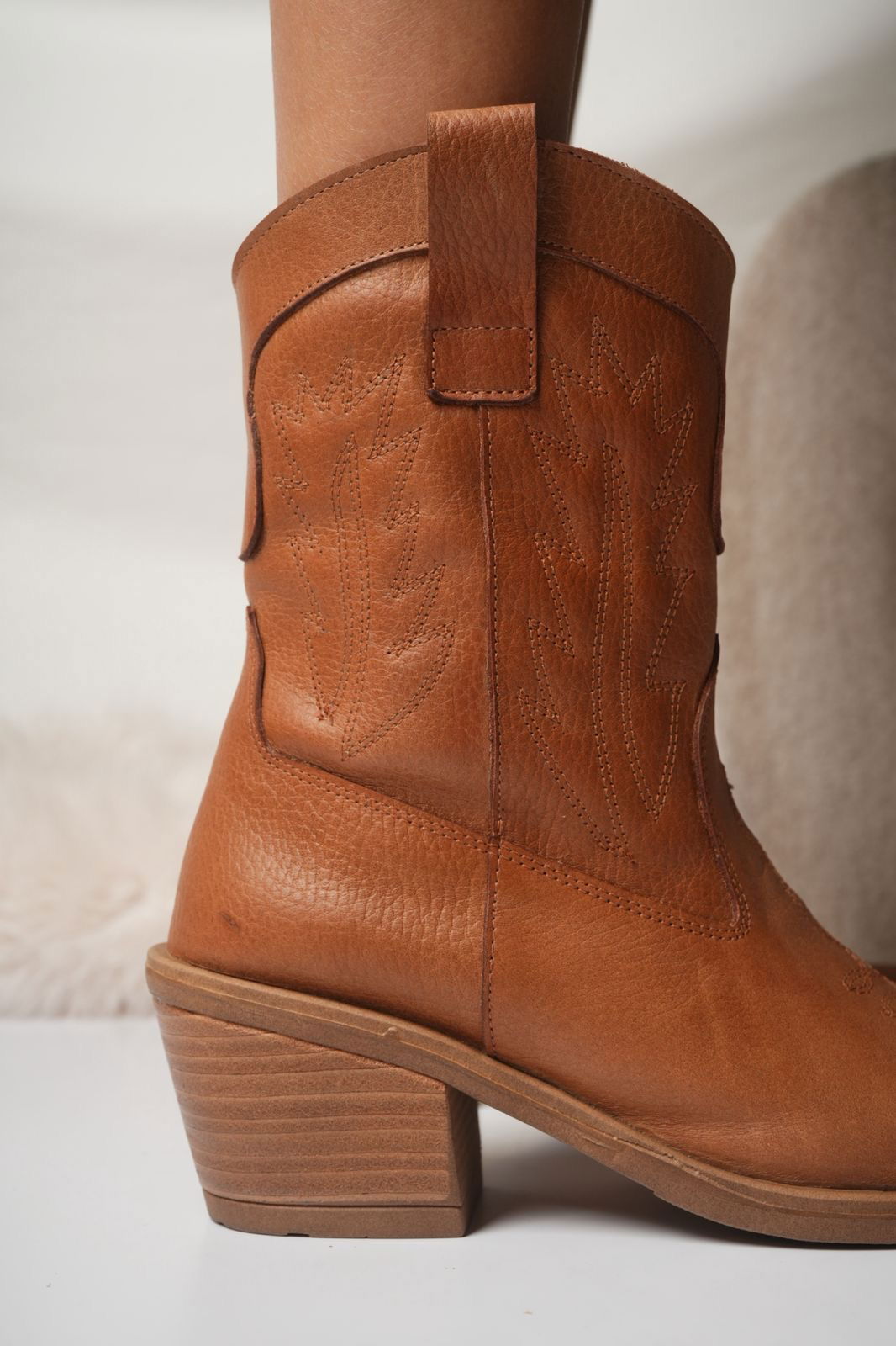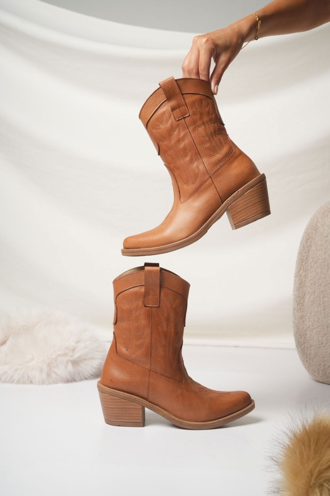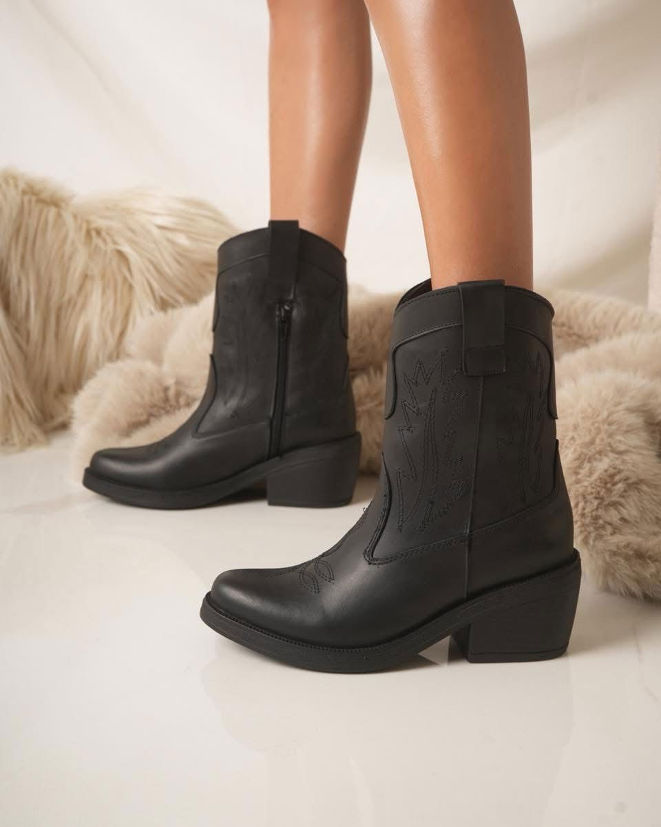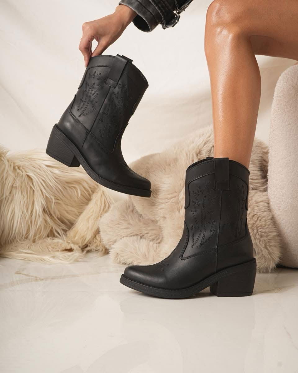 Las texanas Tex están confeccionadas en cuero de alta calidad, con un diseño de media caña que estiliza la pierna y aporta un look clásico con un toque moderno. Sus detalles bordados realzan el diseño y suman sofisticación, convirtiéndolas en un infaltable