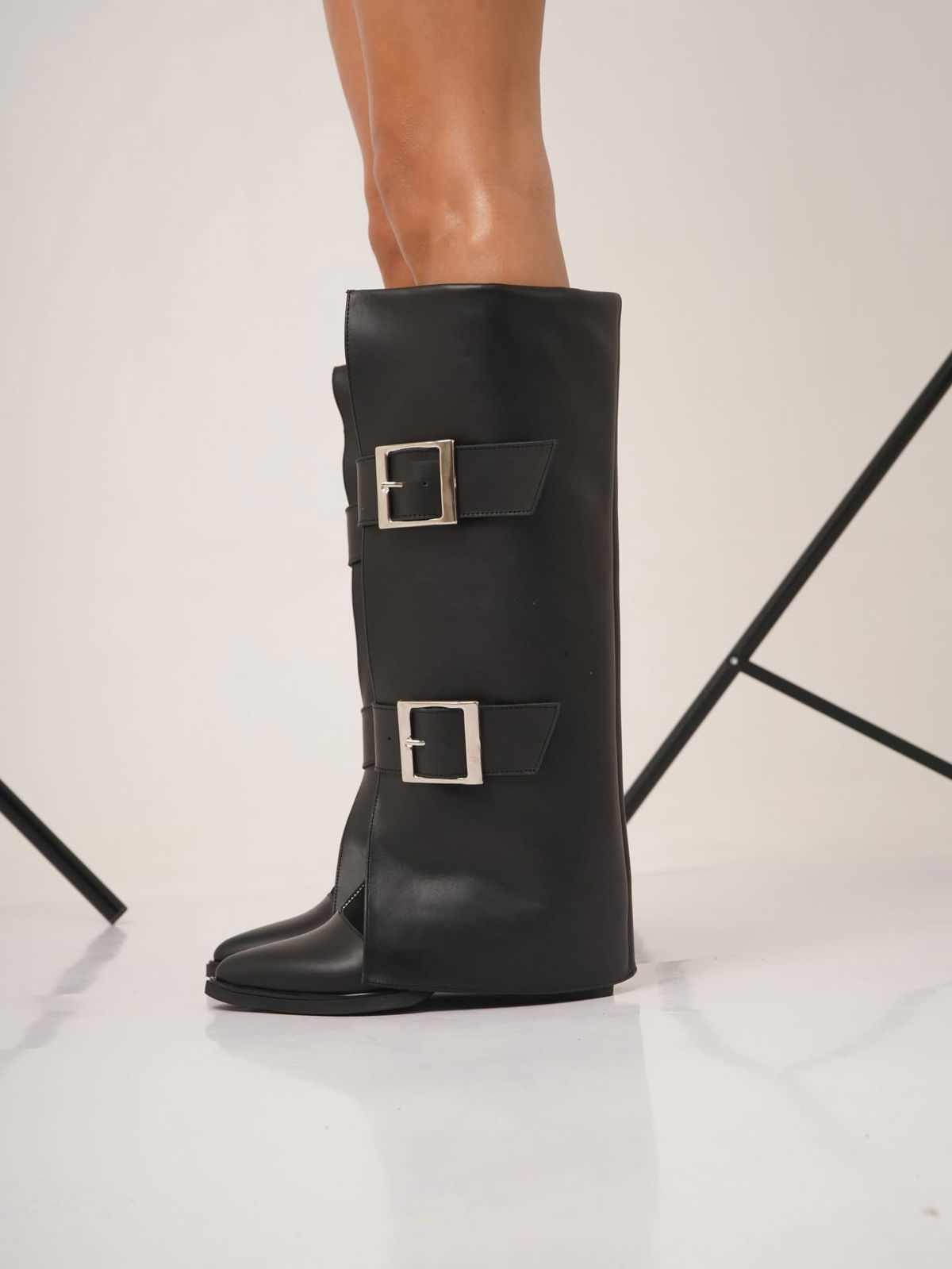 Botas de caña alta en cuero 100%, un modelo protagonista de la nueva temporada. Su diseño combina cierre frontal visible con hebillas metálicas regulables, caña 37 cm .aportando un look moderno, urbano y con mucha personalidad. Confeccionadas íntegramente en cuero, ofrecen excelente calidad, resistencia y confort. Ideales para elevar cualquier outfit