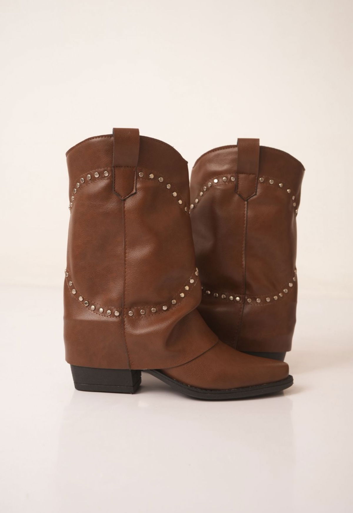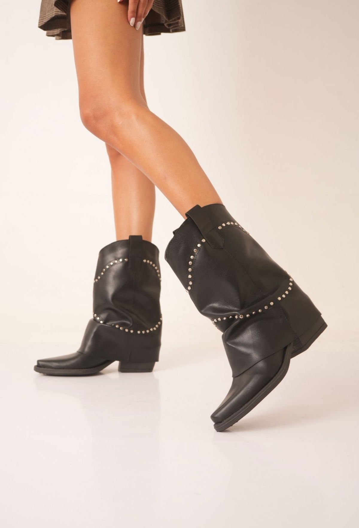 Botas confeccionadas en cuero vegano de excelente calidad, con un diseño moderno y canchero que se destaca por sus detalles de tachas decorativas, aportando personalidad y estilo a cualquier look.