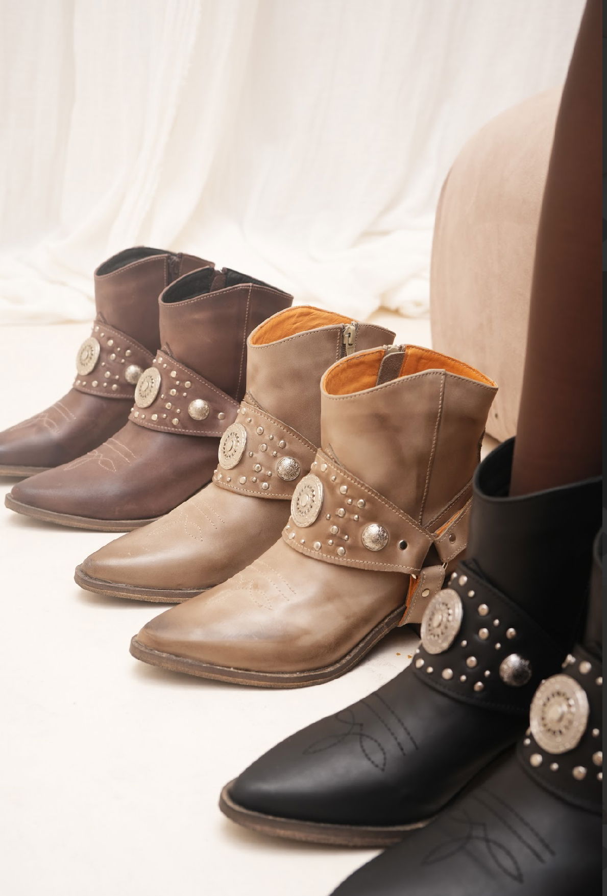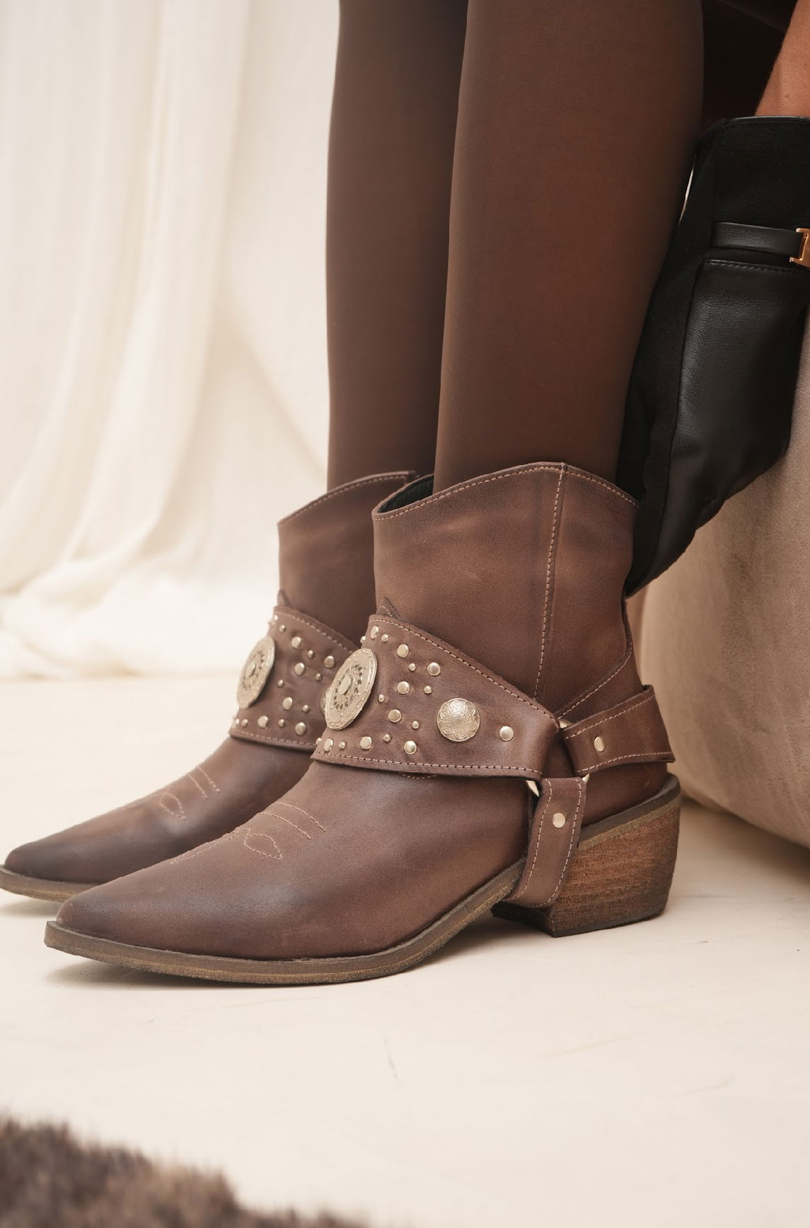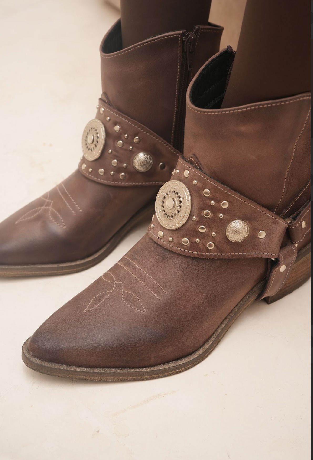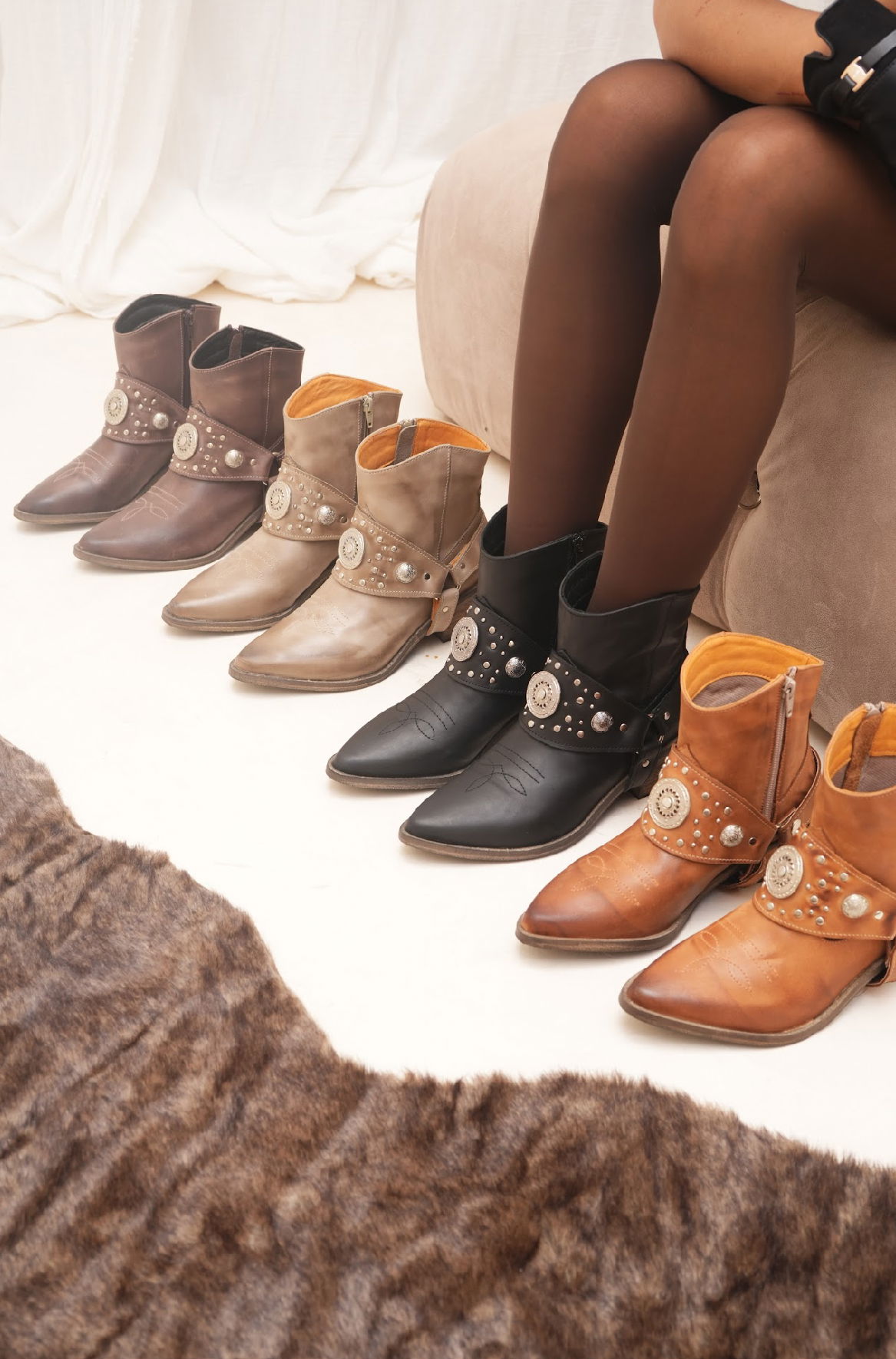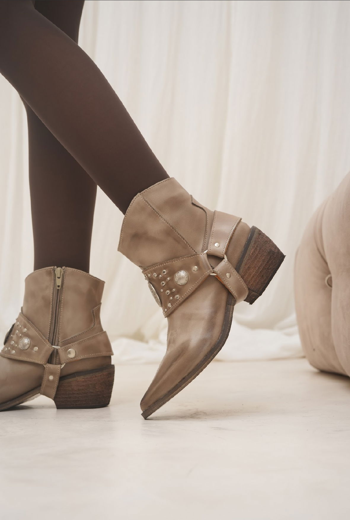 Botineta confeccionada en cuero de alta calidad, diseñada para quienes buscan un calzado versátil y con personalidad. Su detalle protagonista es el estribo desmontable con tachas y apliques metálicos, que permite transformar el estilo del calzado en segundos: podés usarla con el estribo para un look más canchero y protagonista, o retirarlo para un estilo más clásico y minimalista.